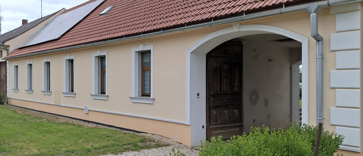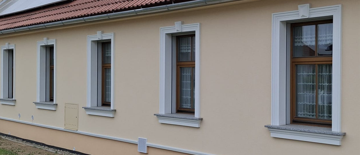 Šambrány z expandovaného polystyrenu pokryté elastickou potahovou hmotou napomáhají zvýraznit linie oken a dveří a umožňují rozmanité architektonické řešení fasády. Výsledkem instalace těchto fasádních prvků je elegantní vzhled, který podtrhuje styl stavby a přitahuje pozornost na první pohled. Dalším použitým prvkem byly ozdobné fasádní prvky z EPS. Konkrétně se jednalo o bosované kameny a klenáky, které vhodně doplňují okenní profily vhodně doplňují okenní profily.